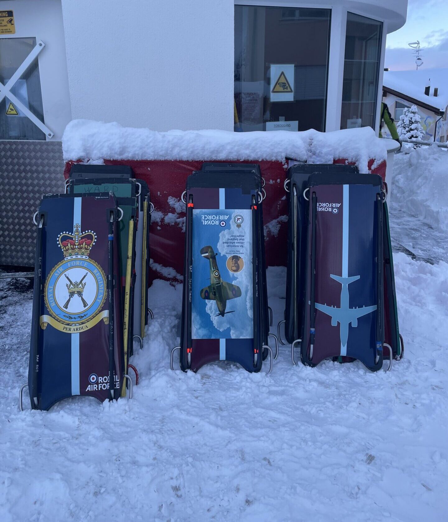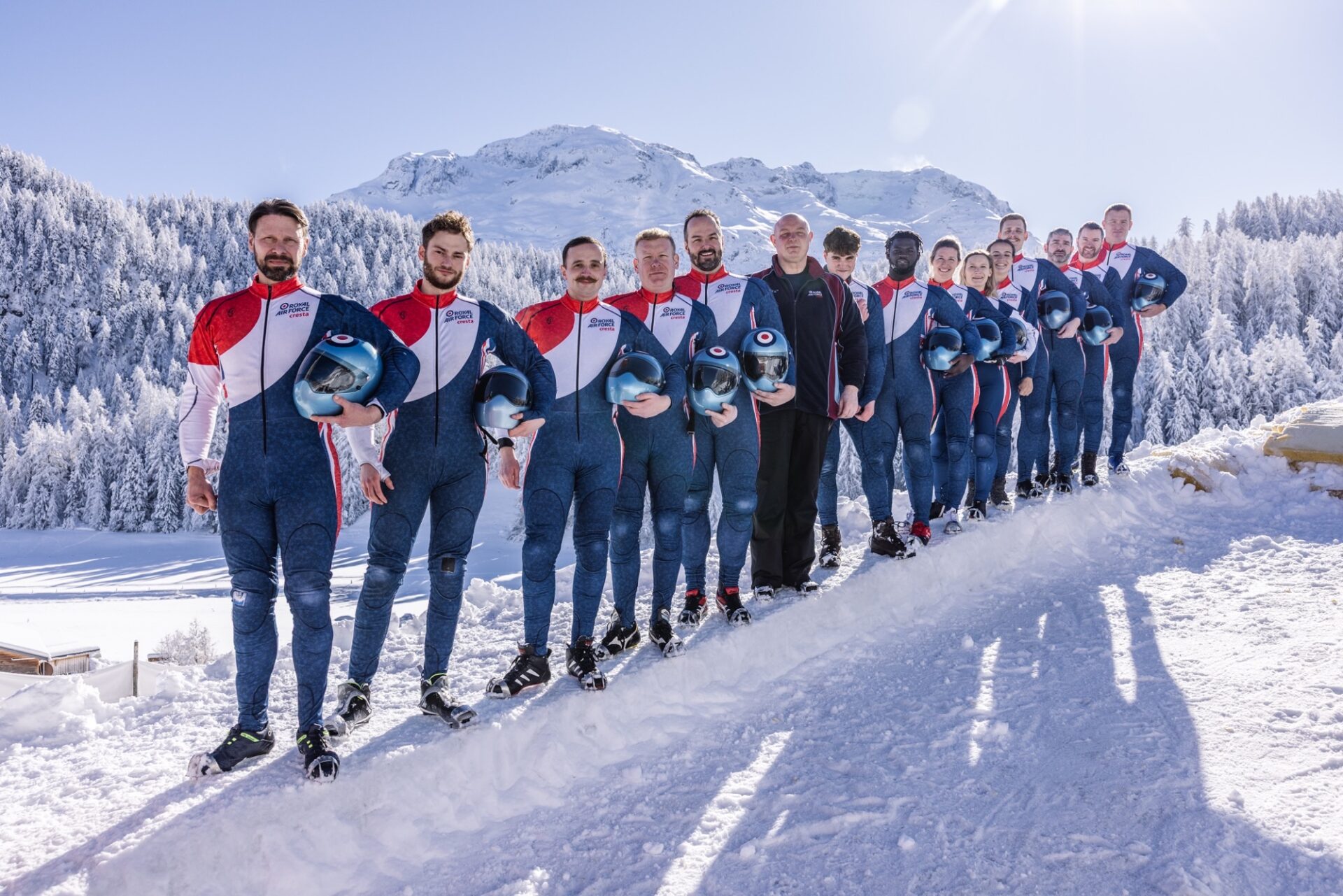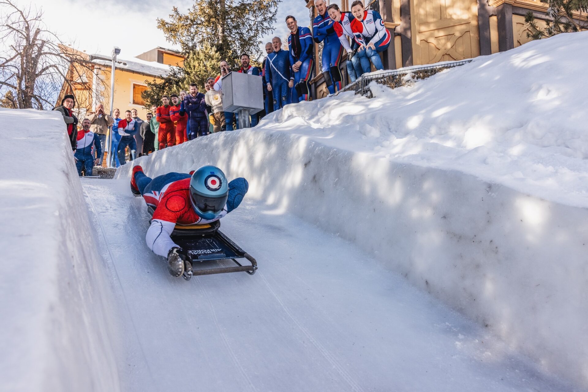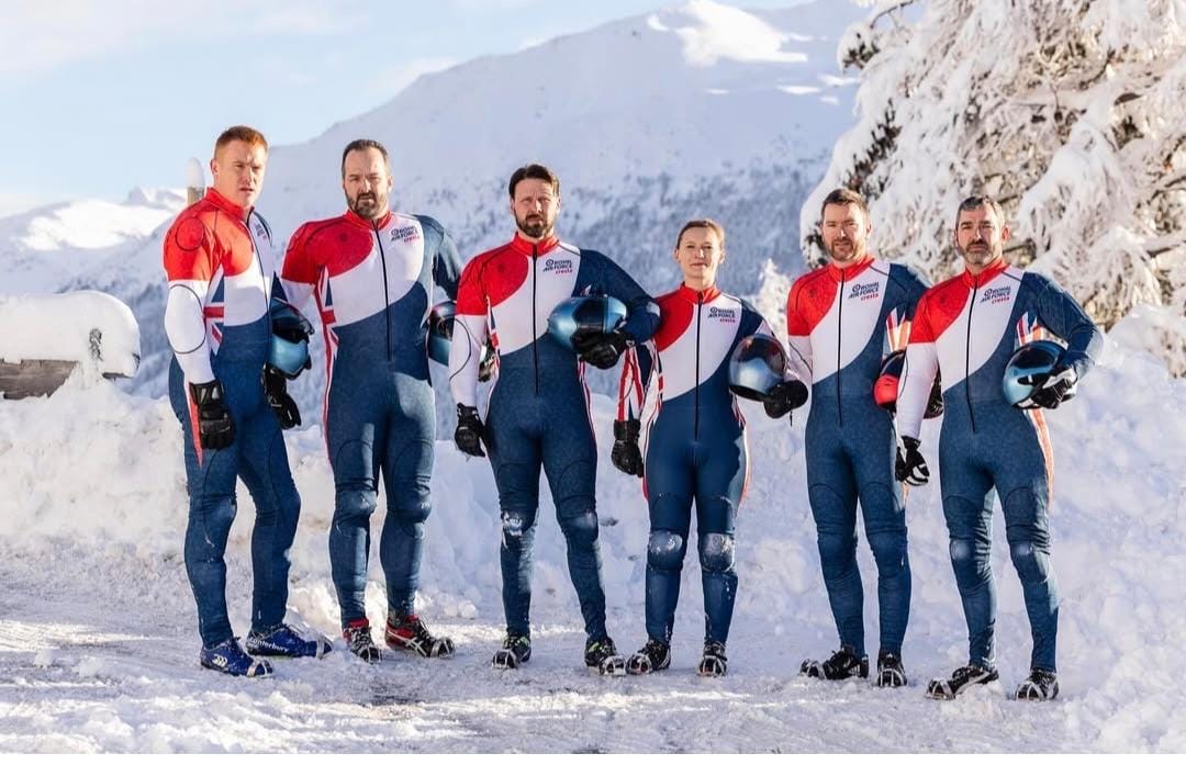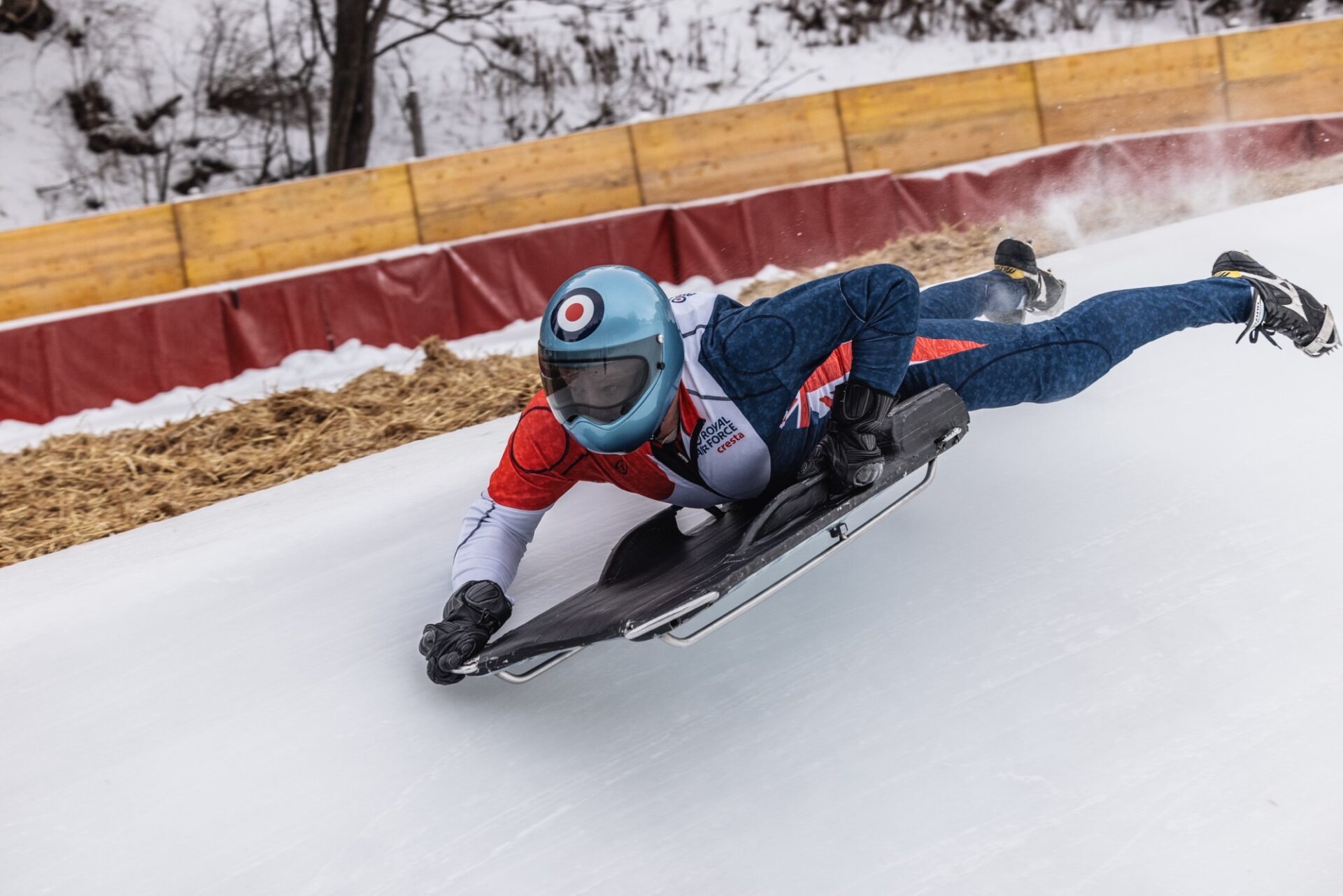 The RAF’s Riders of the Cresta Run; the most challenging and steepest ice run in the world. Between the valleys of the Swiss Alps, Riders will race up to speeds of 80 mph, head first, on a 35 kg toboggan with their face centimetres away from the ice.